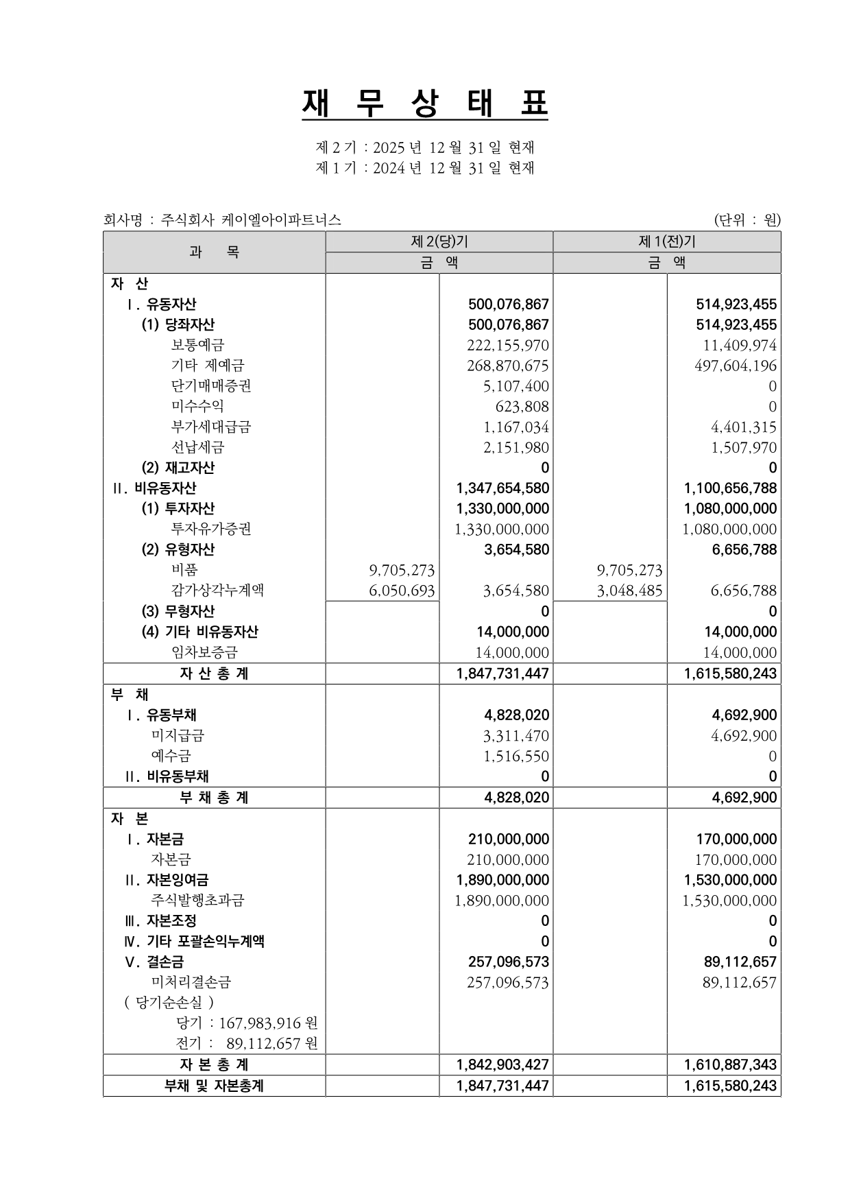 [케이엘아이파트너스] 2025년 재무상태표 공고